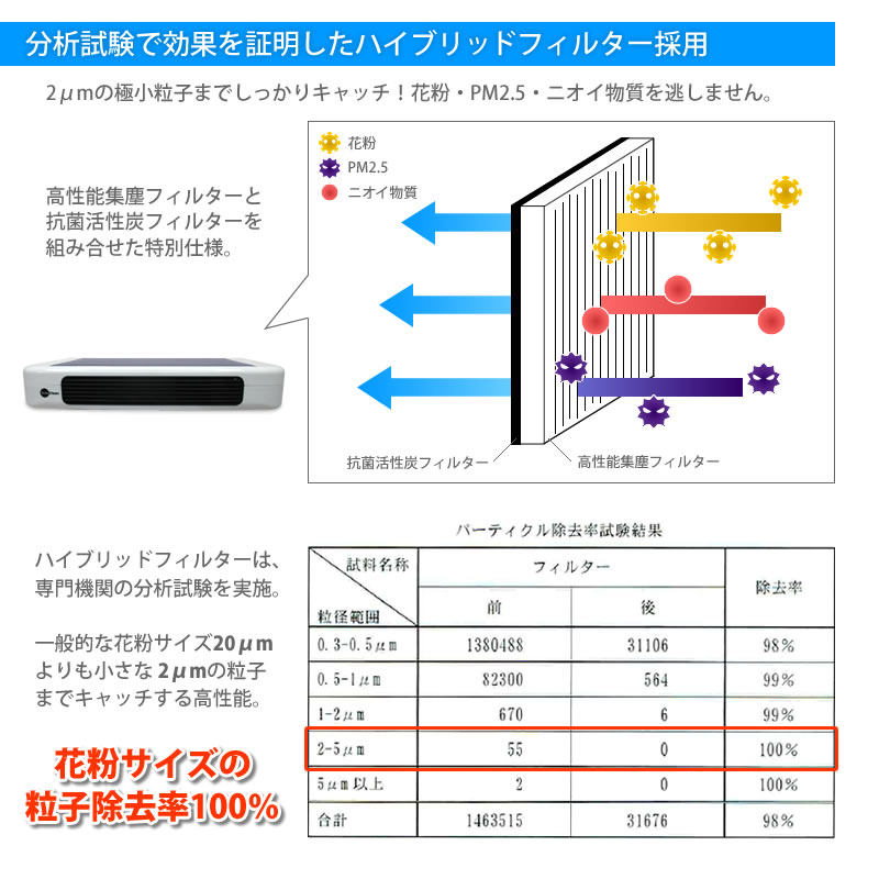 イブリッドフィルター、マイナスイオン、紫外線、消臭活性炭が車内の花粉、PM2.5、細菌を除去し、脱臭を行いマイナスイオンで