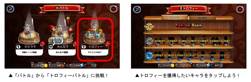 「トロフィーバトル」は、各キャラのトロフィー獲得を目指して、全国のプレイヤーとバトルを行ないます。