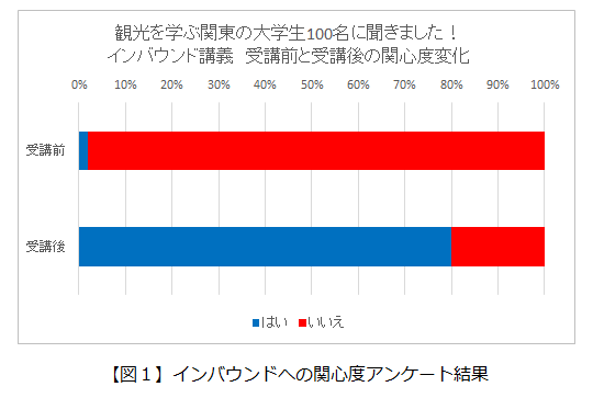 現在、急激に成長しているインバウンド業界では、2020年東京オリンピック・パラリンピックに向けて人材不足が懸念されています。そうした中、基本の知識と実際の現場をつなぐ実践的な内容の講義を増やすことで、インバウンド分野に高い関心と意欲のある若い人材の参入を促進することが可能であるということが、今回のアンケート結果によって確認することができました。