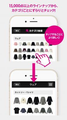 「エル・ショップ」のすべての商品をカテゴリーごとに一覧表示します。タップすることでカテゴリーを移動することができ、直観的な操作が可能です。