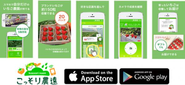 『こっそり農遠』とは、野菜や果物など全国各地の特産品を育てている農園と提携し、月額1980円(税別)よりユーザーがその農園の区画オーナーとしてスマートフォンを通して遠隔栽培を行い、実際に育った作物を産地直送で受け取れる、地方創生に繋がる農業IoT(※)サービスです。