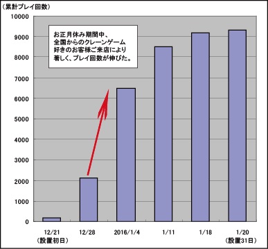 エブリデイ行田店では、これまでの31日間あたりの台ごとの総プレイ回数の最高記録は、人気アニメのフィギュア景品で、2916回でしたが、今回設置した隕石キャッチャーが、その記録を大幅に塗り替え、新記録を打ち立てました。