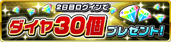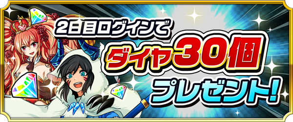本日1月22日(金)より期間限定で通算ログイン日数が2日を達成したユーザーの皆様配信記念特典の、ダイヤ30個(ガチャ6回分)をプレゼントいたします。