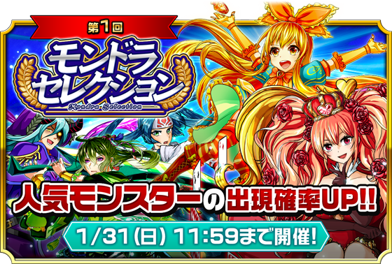 iOS版の配信を記念し、人気が高かったり、バトルに強かったりするモンスターの出現率がアップするスペシャルなガチャ『モンドラセレクション』を開始いたします。今回は特別に開催期間中5体の出現率をアップいたします。