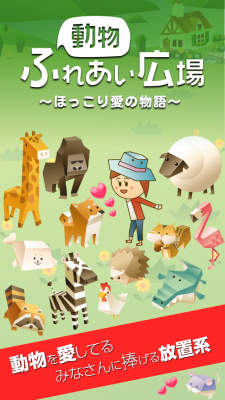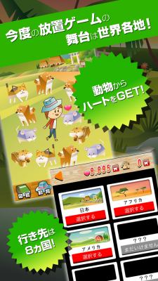 前作「あつまれおっさん酒場」の看板娘が今回の主人公。動物をタップやスワイプすることでふれあって、一定のふれあい回数を超えるとその動物が仲間になります。一定数の動物を仲間にすると、次のステージの国に行けるようになります。