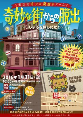 本主催の「志布志市」は、エンターテイメント業界で今注目の「リアル謎解きゲーム」を、街の活性化として活用したいと企画。謎制作は、合同会社ハレガケが担当した。商店街を「奇妙な街」として、非日常の舞台として設定し、志布志市のゆるキャラのししまるを探し出す冒険物語とすることで、今までとは違う角度から商店街をひとつのエンターテイメント空間としてPRをして、さらに幅広い層に参加してもらいたいと考えた。謎がすべて解けた人のみが参加できる豪華抽選会もあるということで、志布志市では注目のイベントとなっている。