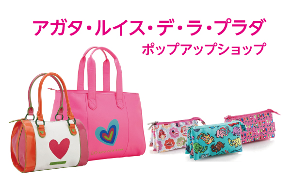 ポップアップショップでは、Agatha Ruiz de la Prada(アガタ・ルイス・デ・ラ・プラダ)の婦人用バッグ、紳士用ネクタイ、iPhoneケース、リュック各種、小物入れ各種、ノート、ボールペンなど、バレンタインシーズンにあわせ、プチギフトや自分へのご褒美として、ちょっとしたプレゼントに最適な商品を多数出品します。