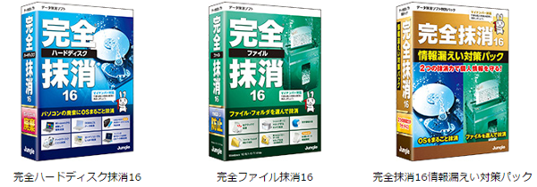 株式会社 ジャングル(本社:東京都千代田区、代表取締役 高田晃子 以下、ジャングル)は、Windows からの実行時にも OS(Windows)含めハードディスク内のデータをまるごと抹消可能な 『完全ハードディスク抹消16』、日常の使用で蓄積される個人情報や、HDD の空き領域に残されたデータを抹消可能な『完全ファイル抹消16』、「完全ハードディスク抹消16」と「完全ファイル抹消16」をセットにした『完全抹消16情報漏えい対策パック』を 2016年 2月4日(木)より全国の家電量販店および EC サイトで一斉に販売開始いたします。