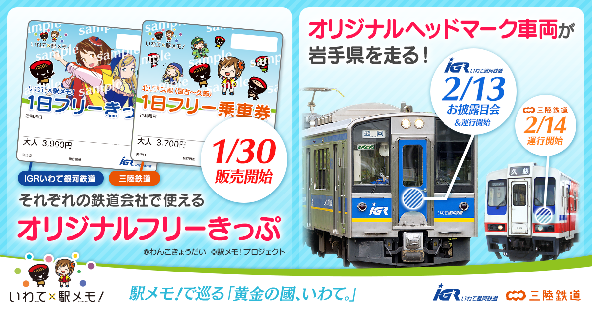 株式会社モバイルファクトリーは、現在開催中の「いわて×駅メモ!」キャンペーン特別企画として、2016年2月13日(土)よりIGRいわて銀河鉄道、2月14日(日)より三陸鉄道(北リアス線)の路線でオリジナルデザインヘッドマークを掲出した車両を運行します。