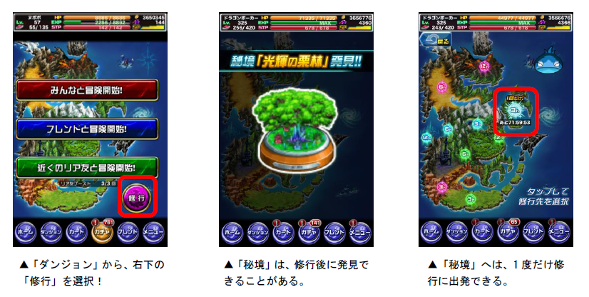 ※「秘境」へ修行に行かない場合、発見後72時間で消滅します。