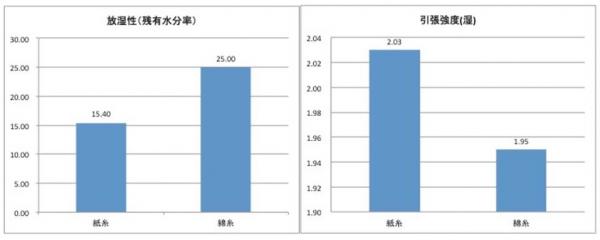 一般的には「紙」は溶ける、柔らかいという印象がありますが、完成した紙を一度裁断して撚るので、いわゆる糸撚りのような作り方のため強度もあるのです。下記に一般的な綿糸(20単糸)と紙の糸の比較データをご参照ください。
