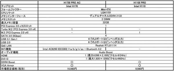 「H170I PRO AC」は、Intel H170チップセットを採用し、Intel AC8260チップによるIEEE 802.11a/b/g/n/ac+Bluetooth 4.2対応の無線LAN機能を標準サポートしたモデルです。本製品の基板背面には、PCI Express 3.0 x4(最大32Gbps)接続のNVM Express高速ストレージを拡張できるTurbo M.2スロットを装備するほか、より安定したメモリ動作と互換性を実現するDDR4 Boostに対応し、コンパクトながら、高性能なシステムを構築可能です。一方、「H110I PRO」は、Intel H110チップセットを採用したエントリーモデルで、基板背面にPCI Express 2.0 x4(最大20Gbps)のM.2スロットを装備するほか、PCI Express x16スロットには重量級のグラフィックスカードも安心して使えるVGA Armorを装備するなど、柔軟な拡張性を備えています。両製品の投入により、最新技術をサポートしつつ、省スペースで高性能なシステムを容易に実現できるようになります。なお、その市場想定価格(税別)は、それぞれ、16,980円と9,980円の見通しです。