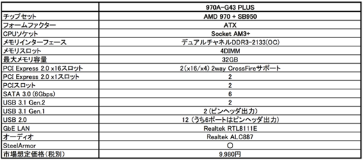 本製品は、チップセットにAMD 970を採用し、AMD-FXなどのSocket AM3+/AM3 CPUをサポート。オンボードでASMediaのUSB 3.1 Gen.2コントローラASM1143を搭載することで、バックパネルに2ポートのUSB 3.1 Gen.2 Type-Aポートを備えます。また、PCI Express x16スロットには、重量級グラフィックスカードを堅固に支えるSteelArmorを、AMDプラットフォームとしては初めて採用。また、マルチグラフィックス環境や、高性能CPUを利用しても十分なエアフローが確保できるよう、4つのファン用電源を搭載しています。なお、本製品の市場想定価格は9,980円の見通しです。また、製品の主な仕様は下記の表をご参照ください。
