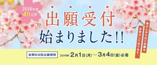 2016年4月入学 前期B日程:2016年2月1日(月)~ 3月4日(金)必着