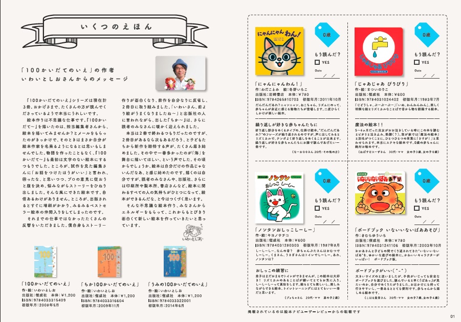 さらに、特に評価の高かった絵本を対象年齢別に紹介するガイドブックを作成し、全国の書店を通じて無料で配布します。ガイドブックには、絵本の内容の紹介はもちろんのこと、絵本ナビ会員のユーザーレビューや対象年齢も掲載しております。また「もう読んだ?」というチェック欄を設けることで、様々な絵本を読んでみたくなる仕掛け作りをしました。冒頭には人気の絵本『100かいだてのいえ』シリーズの作者・いわいとしおさんからのメッセージも掲載しています。