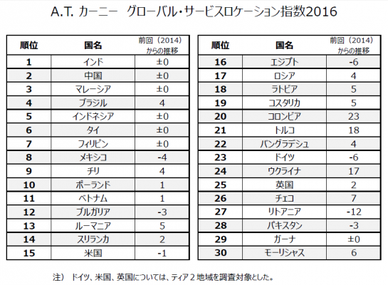 経営コンサルティング会社A.T. カーニー(本部:米国イリノイ州シカゴ、東京オフィス:港区)は、『2016年度グローバル・サービス・ロケーション指数調査』を実施し、世界のアウトソーシング対象国(オフショア市場)の魅力度ランキングを発表した。