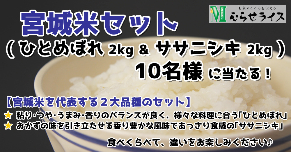 アンケートにお答えいただいた方の中から抽選で10名様にむらせライス「宮城米セット(宮城県産ひとめぼれ2kg&宮城県産ササニシキ2kg)」をプレゼントいたします。