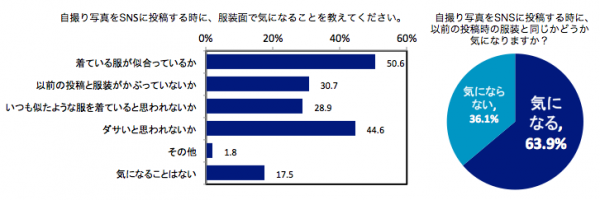 さらに「自撮り写真をSNSに投稿する時に、以前の投稿時の服装と同じかどうか」気にしている女性は64%も!また同じ服着ていると思われたくない…という女心が見て取れる結果となりました!