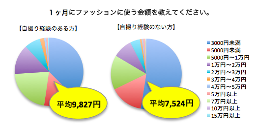 こちらの回答からは、自撮り経験のある女性ほど、ファッションへの消費金額が多いことが分かり、「自撮り消費」とも言える女性の消費行動が生まれてきているとも言えます。