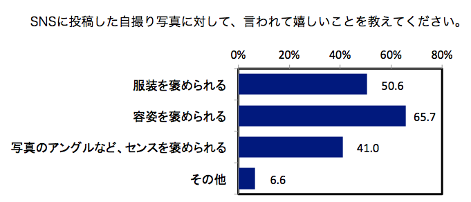 さらに、自撮り投稿で、約5割が「服装」を褒められると嬉しいことが分かりました。「自撮り」は顔や表情に意識が向くと思われがちですが、「服装」にも注意を払っている女性が多くいることが予想されます。