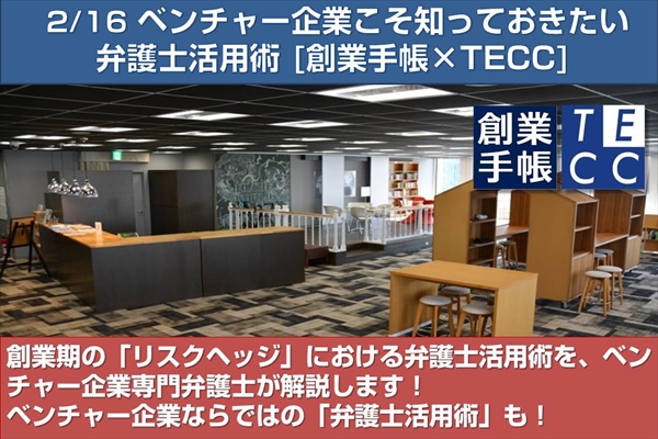 起業家向けビジネスメディア「創業手帳」を運営するビズシード株式会社(本社:東京都中央区 代表:大久保幸世)とベンチャー・グローバル企業の労務管理(雇用契約、就業規則など)を弁護士・社労士が無料でサポートする国家戦略特区事業を行うTECC(東京圏雇用労働センター、以下TECC)が起業家向けの無料セミナーを2月26日に東京・赤坂で開催します。