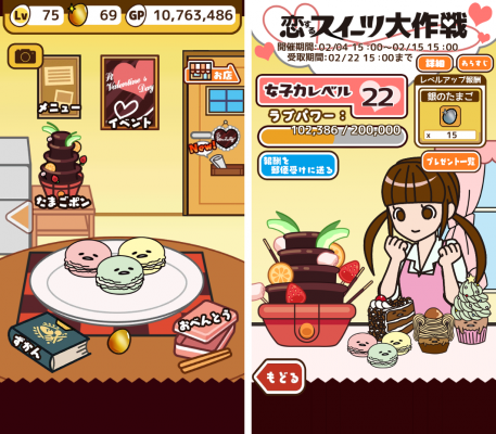 「恋するスイーツ大作戦」は、プレイヤー全員の協力が必要になるイベントです。イベント期間中、対象の「バレンタイン限定ぐでたま」を各プレイヤーが料理することで獲得できる「ラブパワー」の合計数に応じて「女子力レベル」がアップします。「女子力レベル」がアップすればするほどプレイヤー全員が様々な報酬を獲得できるイベントです。
