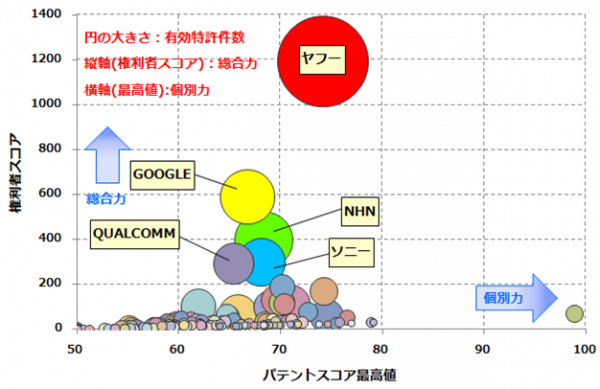 その結果、特許総合力ランキング(注1)は、1位 ヤフー、2位 Google、3位 NHNとなりました。