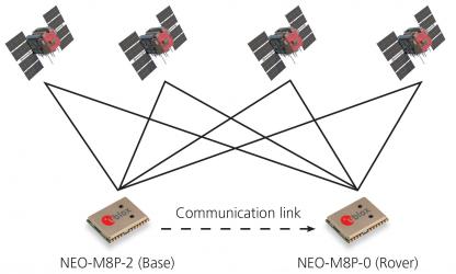 小型サイズ(12.2 × 16 × 2.4mm)のNEO-M8Pは、GPSとGLONASS衛星のナビゲーション・システムを利用しており、小型でありながら高い精度を提供するGNSS RTK(リアルタイム・キネマティック)モジュールです。ローバー(移動局)である「NEO-M8P-0」が、通信リンクを介してベース・レシーバー(固定局)である「NEO-M8P-2」からのRTCM(海事サービスのための無線技術委員会)プロトコル補正データを受信することで、センチメートル・レベルの測位精度を実現します。