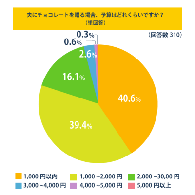 夫へ贈るチョコレートの予算は、「1,000円以内」が40.6%でトップ、僅差で「1,000~2,000円(39.4%)」と続き、およそ80%が2,000円以内を予定していることがわかりました。