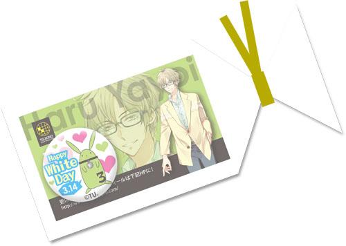 3月14日、ホワイトデー当日、アニメイトにて商品をお買い上げいただいた全ての方を対象に、3月のイメージキャラクター:弥生春(やよい はる)がプロデュースしたプレゼントの配布を行います。