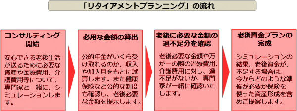 専門家が老後の備えに対して「自助努力」のお手伝いをする「リタアメントプランニング」では、まず老後の備えとして必要な資金を、年金定期便などを活用し、受け取れる公的年金なども加味したうえで、一人一人のケースに合わせてお金の専門家がシミュレーションいたします。その上で、どのように解決しなければならないのか明確にし、適切なアドバイスを無料で提供いたします。