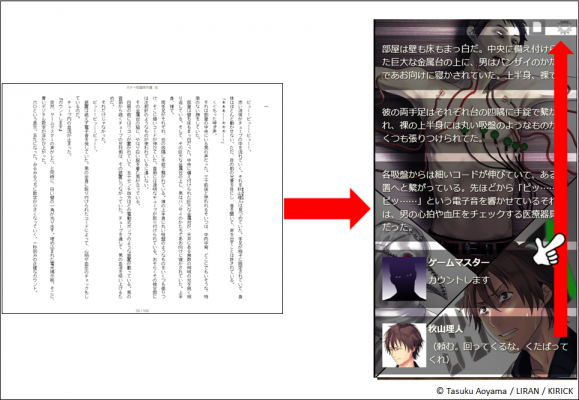 小説やノベルゲームをシナリオ化して、ビジュアルを付加した新感覚の次世代ブックです。セリフや文章を一定の文字数で区切ってウィンドウ内に配置することで、読みやすさを追求。ページをめくって読み進める従来の小説とは異なり、スクロール動作で閲覧するデジタルならではの仕様となっています。また、舞台や登場人物などのイラストを、文章と併せて表示することで、物語をより分かりやすく表現可能にしました。