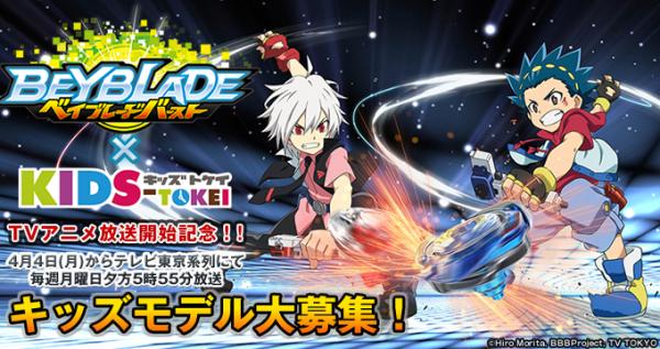 ベイブレードとはパーツを組み替えて改造できるバトル専用コマ。1999年の誕生以来、世界80以上の国と地域で展開され、玩具の累計出荷数3億5,000万個以上、累計売上3,650億円以上(市場べース)を記録し、世界中の子どもたちを熱狂させています。その第3世代となる「ベイブレードバースト」は新ギミック「破壊(バースト)」を搭載し2015年に発売開始、小学館「月刊コロコロコミック」に連載され、いよいよ2016年4月4日よりテレビアニメが放映されることになりました。待望のテレビアニメ化を記念して開催される『ベイブレードバースト×キッズ時計』。グランプリに選ばれたキッズモデルは地上波テレビCMまたは衛生放送番組に出演できます。
