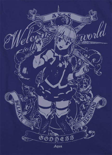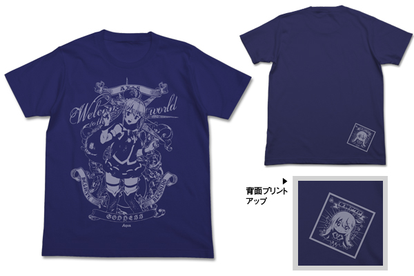 「水の女神アクアTシャツ」はアンティーク風の装飾で女神らしくアクアの姿をデザイン!背面にはデフォルメされた姿をシール風のデザインでプリント、美しく可憐なアクアの姿を愛でられるアイテムだ!