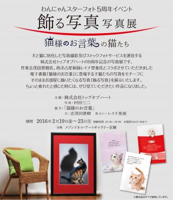 犬猫に特化した写真撮影及びストックフォトサービスを提供する株式会社トップオブハート(所在地:東京都新宿区)は、5周年記念イベントとして、電子書籍『猫様のお言葉』に登場する子猫の写真を中心に『飾る写真・写真展~猫様のお言葉の猫たち~』を2016年2月19日(金)~2月23日(火)に開催する。電子書籍『猫様のお言葉 ネ・コ・ト・バ』は作家・ 志茂田景樹氏とのコラボによるもので、会期中には志茂田景樹氏によるトークショー&サイン会も予定している。
