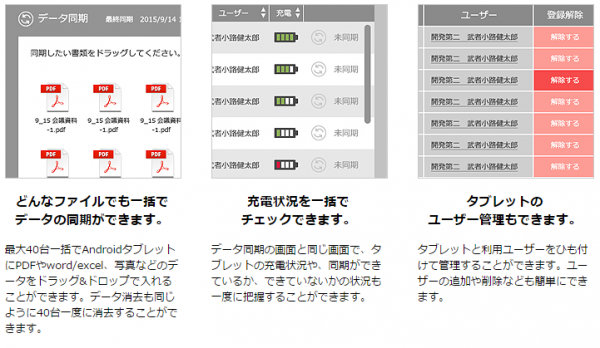 タブレット端末を複数台利用する企業や教育機関(小学校・中学校・高校・専門学校・大学)、ペーパーレス会議など、多数のタブレット端末を充電/データ同期するシーンで活躍します。