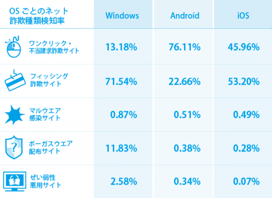 インターネット詐欺の種類別構成比は、ワンクリック・不当請求詐欺サイトが50.73% (前月比9.87ポイント減)、フィッシング詐欺サイトが42.39%(前月比9.45ポイント増)、マルウエア感染サイトが0.65%(前月比0.36ポイント増)、ボーガスウエア配布サイトが4.99%(前月比0.13ポイント増)、ぜい弱性悪用サイトが1.24%(前月比0.07ポイント減)でした。