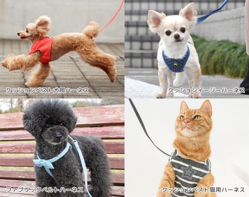 ベストタイプのものは裏地のクッションメッシュ素材が首や身体への衝撃を面で吸収するので、引っ張りグセのある子や、首・気管支の弱い子、ベビーや老犬などでも負担をかけず安全にお散歩することが出来ます。リードとハーネスが独立したタイプのものと、装着簡単な一体型の簡易ハーネスの2種類をご用意いたしました。