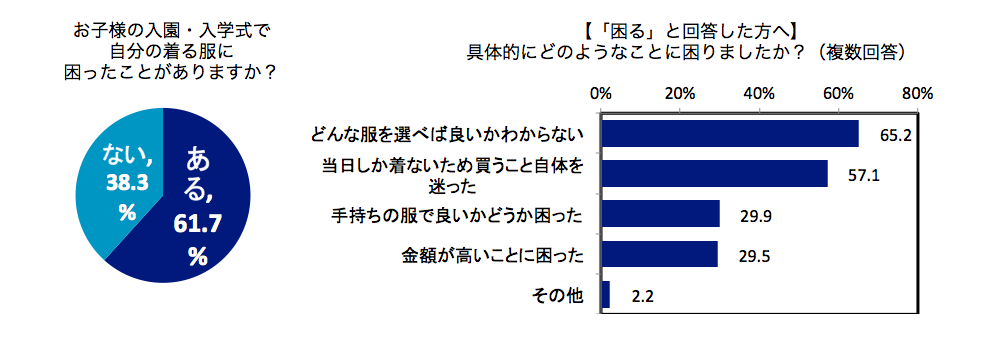 さらに、入園・入学式で自分が着る服に「困ったことがある」方は約62%いらっしゃるという結果に。具体的には「どんな服を選べば良いかわからない」(65.2%)、「当日しか着ないため買うこと自体を迷った」(57.1%)と いう内容が多い結果となりました。どちらかというと「金額」というより、着る機会が少ないものに時間やお金を投資するかどうかで迷っている方が多いことが予想されます。
