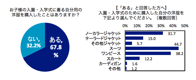 「子どもの入園・入学式に着る自分用の洋服を購入したことがある」と回答した方は全体の約7割に上りました!多くのお母さんが、式のために新たに洋服を調達し ているようです。その内訳は「スーツ」(44.7%)が一番多く、次いで「ワンピース」(38.2%)、「ノーカラージャケット」(31.7%)となっていることから、セットアップではなく単品で購入されている方も多いことがわかります。