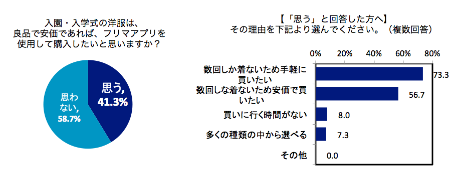 最近人気となっている、スマートフォンのアプリ上で個人間のフリーマーケットが行える「フリマアプリ」ですが、「良品で安価であれば、入園・入学式の洋服をフリマアプリで購入したい」と回答した方は41.3%という結果に。その理由 としては「数回しか着ないため手軽に買いたい」(73.3%)が最も多くなりました。