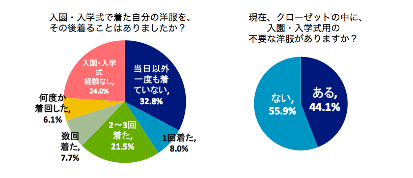 入園・入学式で着た自分の洋服を「当日以外一度も着ていない」という方はなんと3人に1人。さらに「クローゼットの中に入園・入学式用の不要な洋服がある」と回答した方はおよそ2人に1人という結果に!