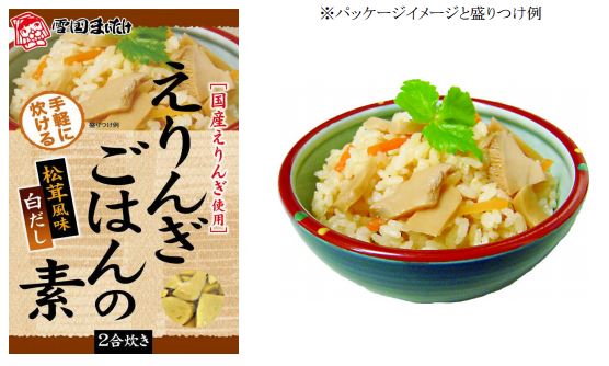 『えりんぎごはんの素』は、従来よりご愛顧頂いております『舞茸ごはんの素』の姉妹品として発売する商品で、100%自社生産のえりんぎを使用した新商品となります。