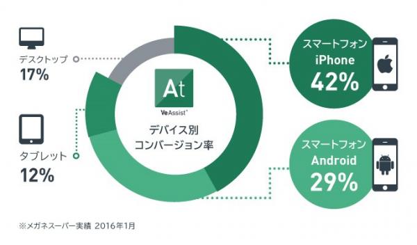 メガネスーパーの自社ECサイトのデータによると、VeAssistによるコンバージョンはスマートフォン経由では71%を占め、タブレットは12%、デスクトップは17%となっています。メガネスーパーでは全体の63%がスマートフォンから商品を購入していますが、VeAssist経由の商品購入はスマートフォンからの購入比率がさらに高くなる傾向にあります。さらに、通常のサイト全体の新規ユーザーの購入比率は35%に対し、VeAssist経由の新規ユーザーの割合は69%となっており、新規のユーザーの獲得にも効果が出ております。