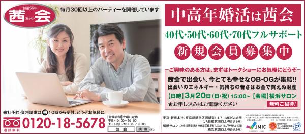 昨年創立55年を迎えた老舗結婚相談所である日本健康管理株式会社(東京都新宿区、代表取締役 川上喜彦 以下、茜会、http://www.akanekai.co.jp/)が、平成28年3月20日(日・祝)1日限定で、業界初!パートナーと出会った方たちの「トークショーOB、OG会~気持ちの若さはお金では買えぬ財産」を実施する。