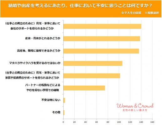 女子大生に対し「結婚や出産を考えるにあたり、仕事において不安に思うことは何か」と質問したところ、6割以上の票を集めて「育児・家事において会社のサポートを得られるかどうか(140票)」、「産休・育休がとれるかどうか(138票)」、「出産後、職場に復帰できるかどうか(136票)」といった3つが僅差で上位に挙げられました。これらの不安解消には、企業努力が必須であることから、制度作りだけでなく、制度を活用できる風土づくりや職場での理解促進が求められています。