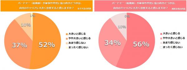 また、「パートナー(配偶者)が家事や育児に協力的かどうかは自分のキャリアに影響すると感じますか?」という問いに対して、女子大生と既婚女性ともに約9割が、影響すると感じていることがわかりました。