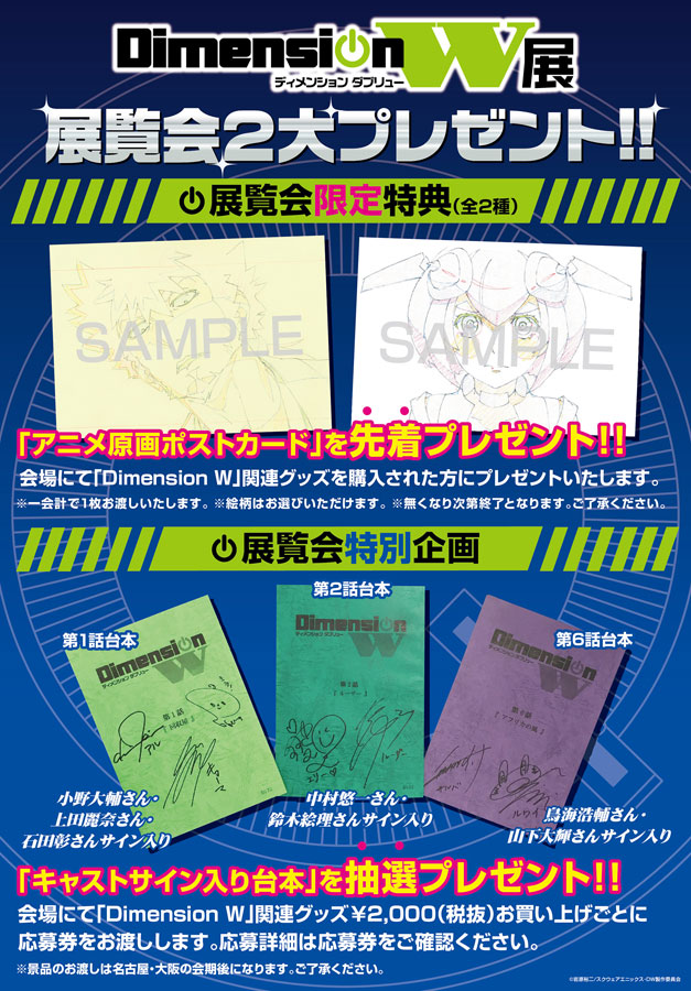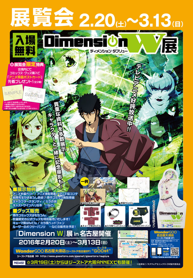 TVアニメが好評放送中の、岩原裕二原作プログレッシヴSF『Dimension W』の展覧会がジーストア名古屋にて開催中。原作コミックの複製原画や岩原先生の直筆サイン色紙、アニメ複製原画や絵コンテなど貴重な資料を多数展示。