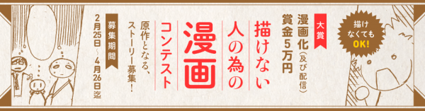 株式会社ネオアルド(本社:東京都豊島区、代表取締役:福井智樹、以下ネオアルド)は、「漫画のネタはあるが絵が描けない!」という方に向けた『描けない人の為の漫画コンテスト』を2016年2月25日より開催いたします。