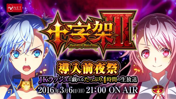遊技機メーカー・ネット株式会社(本社:大阪市 代表取締役:国本幸司)は、3月7日より全国に導入予定のパチスロ新機種「十字架3」の導入前夜祭として、「十字架3」 導入前夜祭 - JKラッシュと戯れるたっぷり4時間の生放送 -をニコニコ生放送の当社公式チャンネル「NET SLOT LIVE!!」より生中継します。